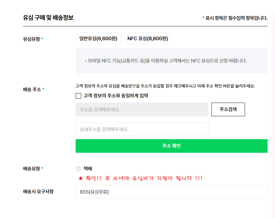 비고란에 ★855★ 대리점 코드를 작성해주셔야 유심비가 지원이 됩니다 !!!